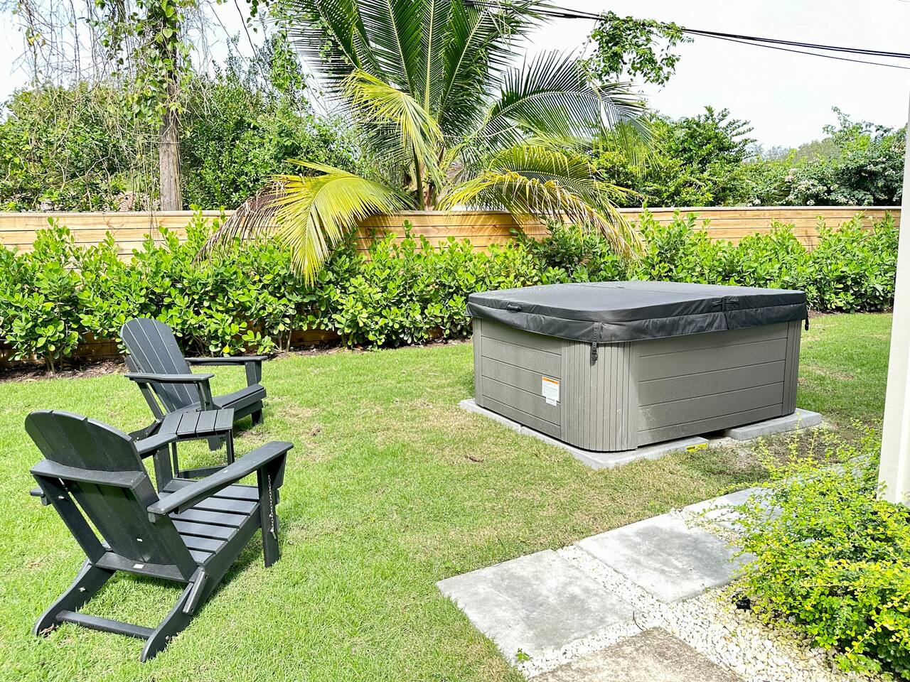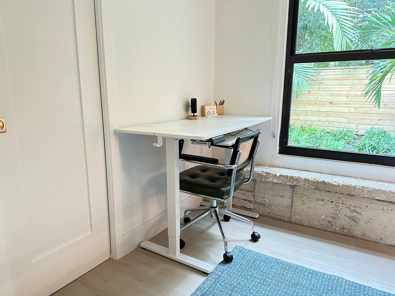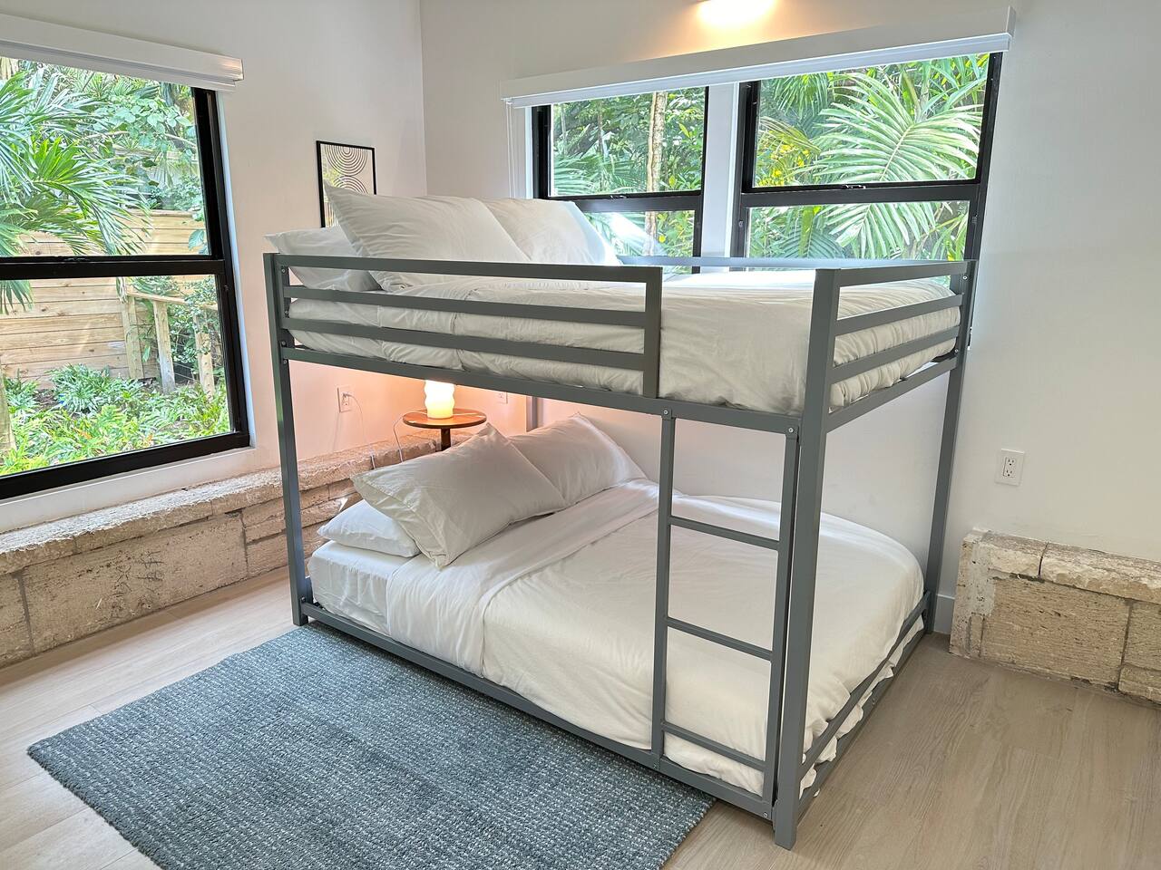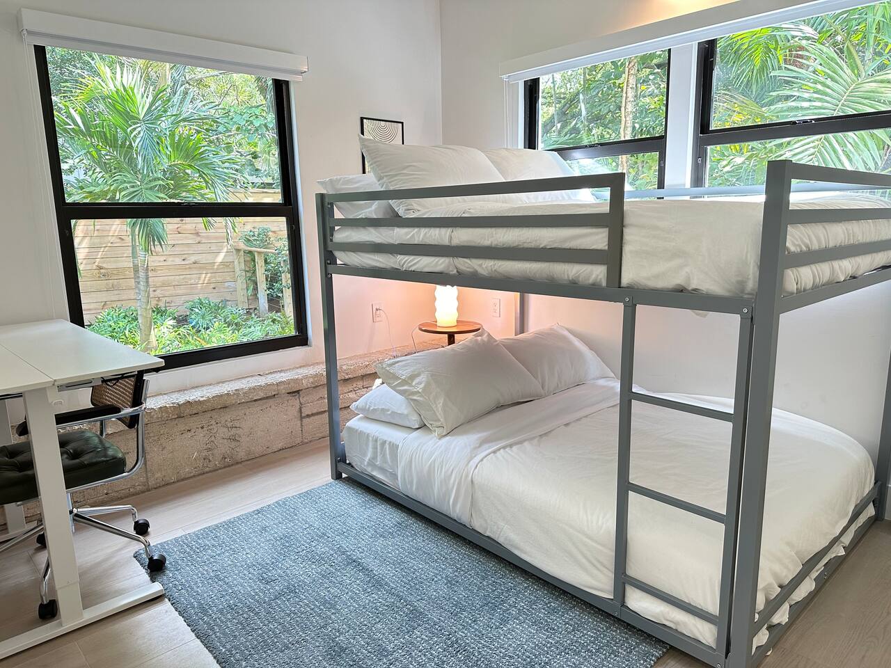 The house features a comfortable kitchen with brand-new appliances and is fully stocked with all the necessary cooking tools. The dining table seats 4 to 5 people. The living room provides a relaxing space with a new smart flat-screen TV, a chimney, comfortable sofa and side chairs, and the sofa conveniently transforms into a sofa bed. Both the living room and bedrooms come equipped with curtains for privacy, with blackout curtains in the bedrooms and privacy/shade curtains in the living room. The master bedroom offers a king-sized bed, ample closet space, and large windows that fill the room with natural light. The second bedroom includes a full-sized bunk bed and an electric desk that can also be used as a standing desk, perfect for working from home. Stay connected with excellent Wi-Fi coverage and high-speed internet throughout the property. For added comfort, the home features a smart Nest thermostat. Outdoors, enjoy the grill, outdoor dining table, jacuzzi, lounge chairs, and a spacious backyard with a well-maintained lawn.